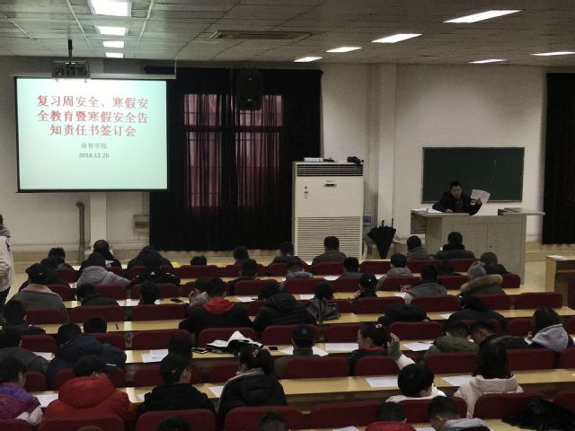 本网讯(通讯员 周柳明)12月26日12时15分,体育学院复习周安全、寒假安全教育暨寒假安全告知责任书签订会在2号报告厅举行。党总支副书记镇方松,辅导员员李祖平参加会议。