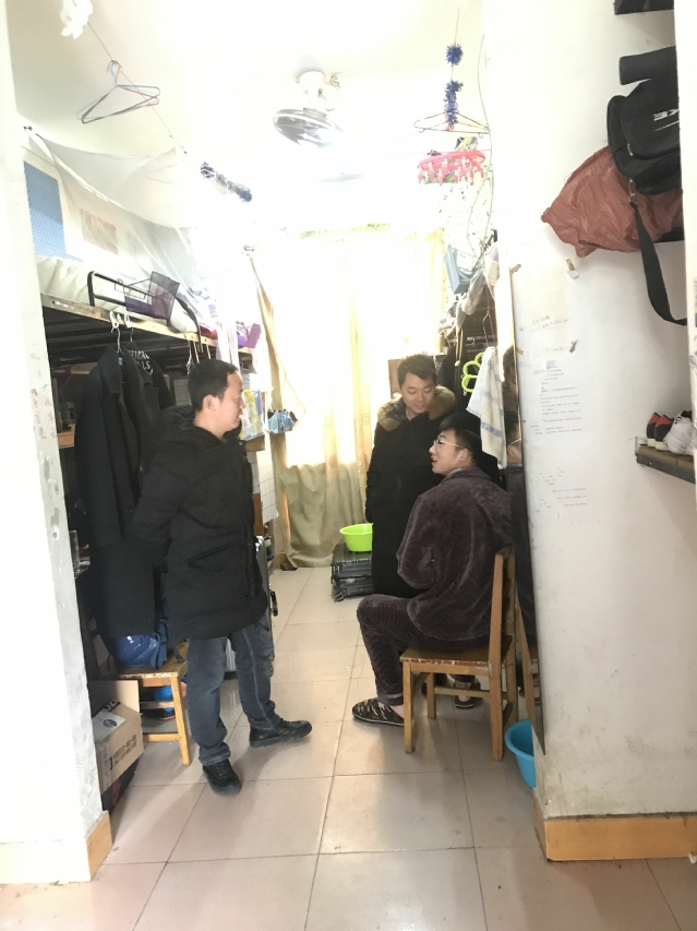 2月23日、24日,新学期伊始,党总支副书记镇方松带领辅导员、班导师走访学生寝室,了解同学们的返校情况及思想动态。