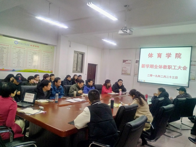 本网讯 (通讯员 向琴英)体育学院新学期全体教职工大会于2019年2月23日上午10点顺利召开。大会对新学期主要工作进行安排。全体教职工参加会议。党总支书记张绍明主持大会。