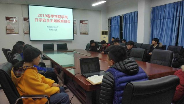 17级休闲体育班级于2月26日晚6:30在体育学院会议室召开学风、开学安全主题教育班会,会议由辅导员李祖平主持,全班35名学生参加。
