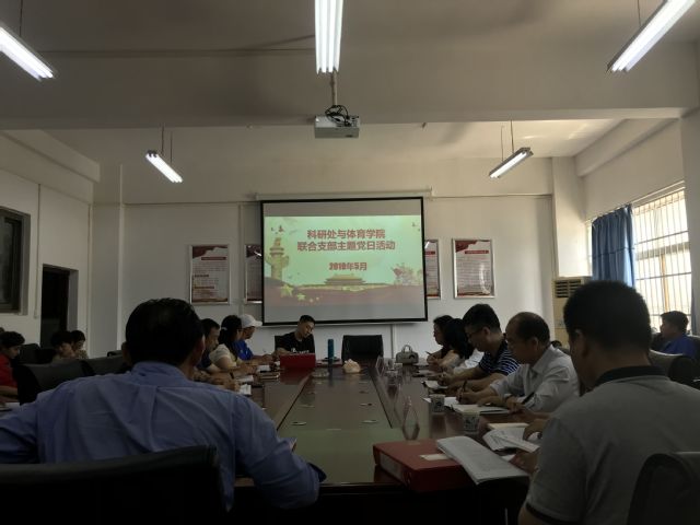 5月23日下午,机关党委科研处党支部与体育学院教师党支部在体育学院会议室联合开展支部主题党日活动。体育学院党总支书记张绍明主持活动。会议伊始,体育学院教师第一党支部书记王丹,带领全体党员重温入党誓词,教师第二党支部书记尹开宁为大家诵读了党章。与会人共同学习了《干部任用条例》,习近平总书记为第五批全国干部学习培训教材所作《序言》精神,大家讨论了习近平总书记在纪念五四运动100周年大会上的重要讲话,学习贯彻落实学校2019年集中整治形式主义、官僚主义暨“三风”建设年活动实施方案。