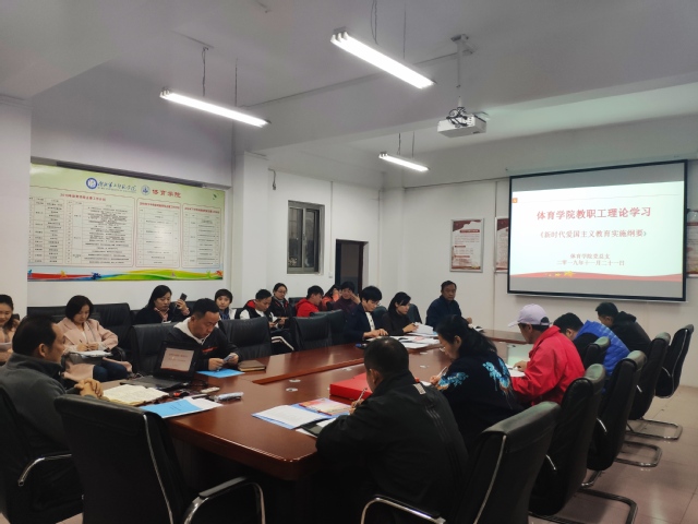 本网讯 (通讯员 向琴英 体育学院十一月份全体教职工大会于11月21日下午13:30在会议召开,会议进行了教职工政治理论学习、近期工作安排与部署。总支书记张绍明主持大会,全体教职工参加会议。