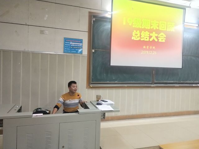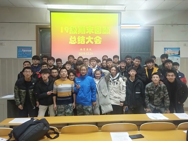 2019年12月26日晚,体育学院在阶梯教室3组织召开了19级期末回顾总结会,会议由辅导员李祖平老师主持,19级133人参加,会议时长约2个小时。