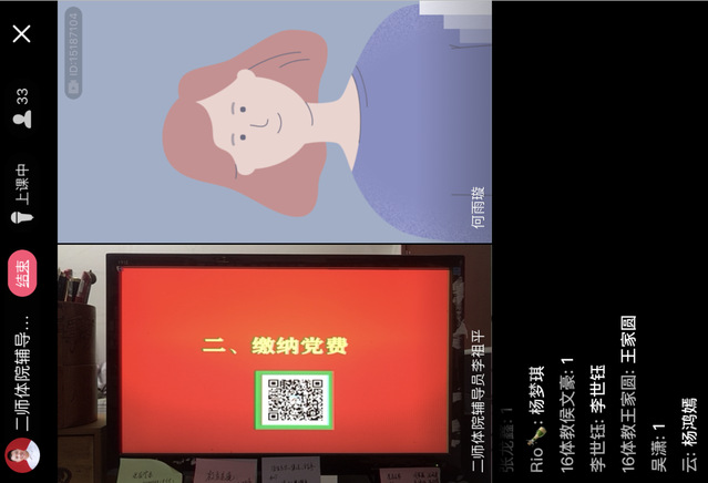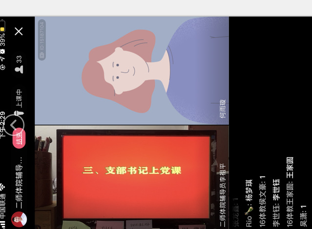 2020年4月29日,体育学院学生党支部通过网络视频会议的形式举行了4月份支部主题党日活动,活动由学生支部书记李祖平主持,全体学生党员共计33人参加。