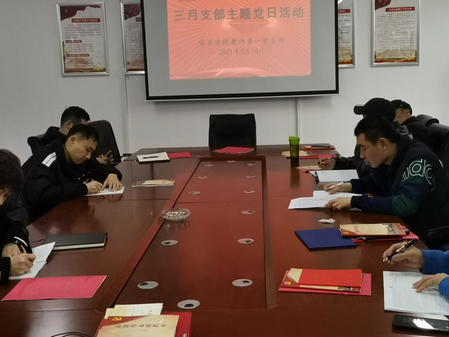 本报讯(通讯员黄亚飞)2021年3月18日下午,体育学院教师第一党支部在体育学院会议室开展3月份支部主题党日活动。会议由支部书记王丹主持。