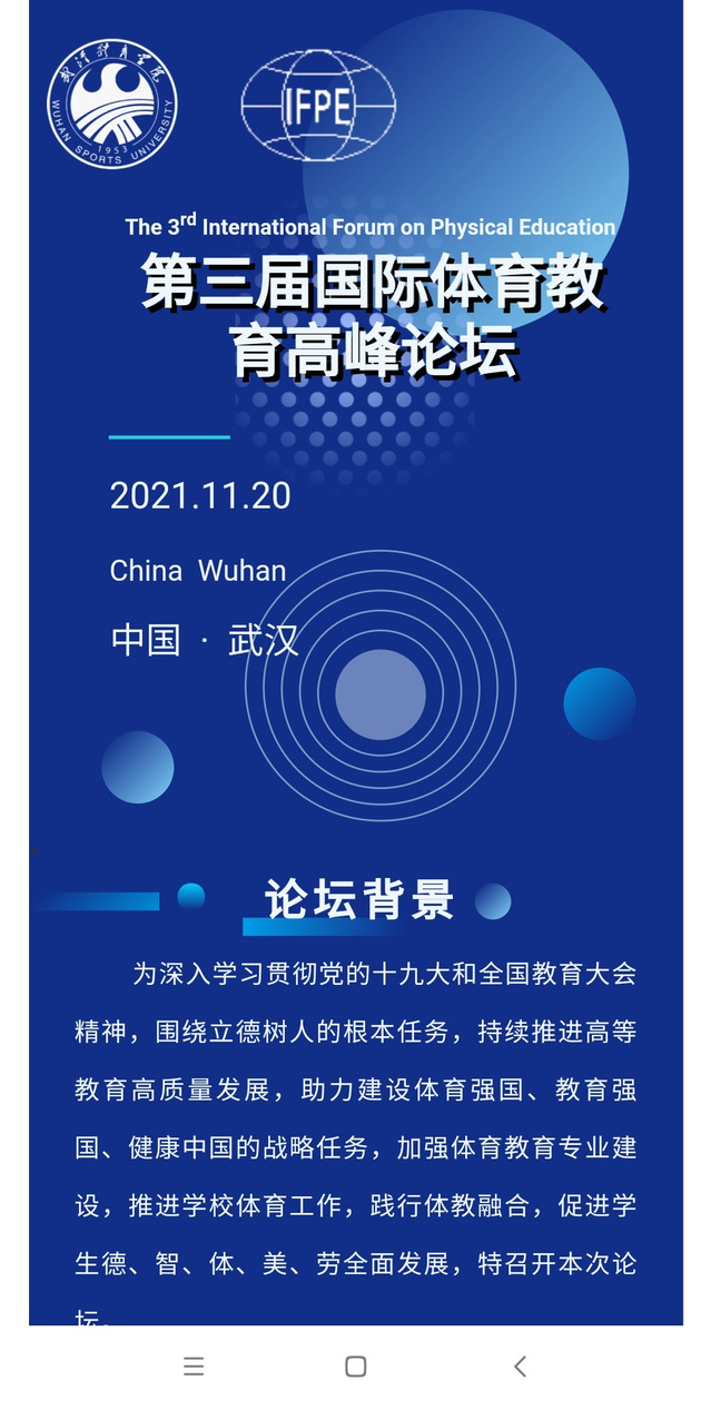 本网讯 11月20日,由武汉体育学院组织的第三届国际体育教育高峰论坛在腾讯会议线上举行,我院体育教育专业孙利红、尹开宁、徐剑、雷学会等教师参加了此次会议。