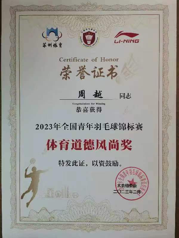 作为疫情后全国第一个羽毛球赛事,中国羽毛球协会高度重视,从全国选调优秀裁判员50名。我院青年教师周越出色完成执裁任务,并获得体育道德风尚奖。(审稿 尹开宁)