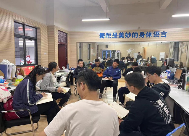 图四:实习生在光谷十二小带队教师的指导下一起评价公开课的优缺点