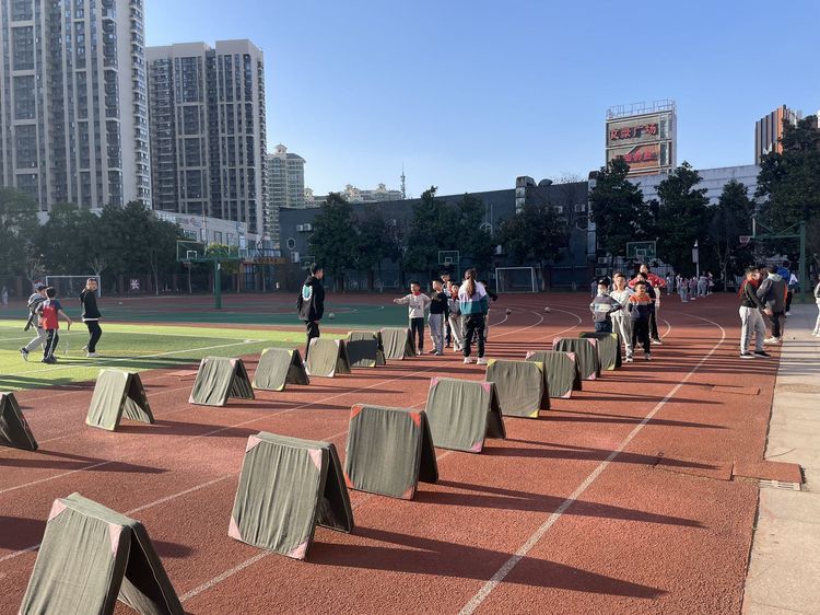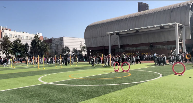 为增加学生的课后体育活动时间,提高学生的身体素质。光谷八小的学生在大课间做完广播体操后,会以班级为单位开展了趣味性体育游戏,如迎面接力、穿越障碍物、跳长绳等。