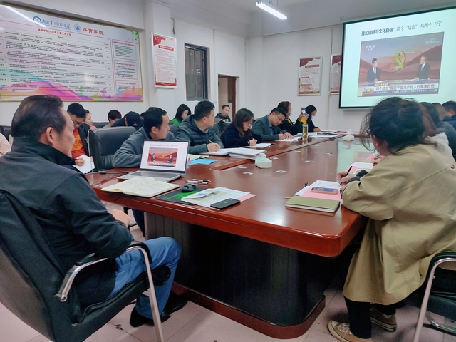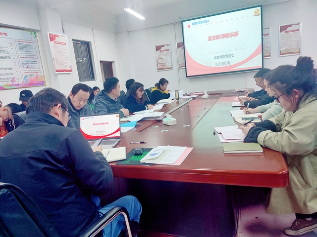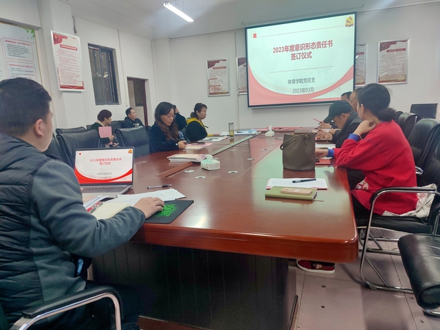 本网讯(通讯员 向琴英) 3月30日中午,体育学院在会议室召开全体教职工大会。会议进行三月份教职工政治理论学习、对相关工作进行部署、教职工廉洁知识网络问答及2023年度意识形态、党风廉政建设责任书责任书签订等内容。全体教职工参会。总支书记张绍明主持大会。