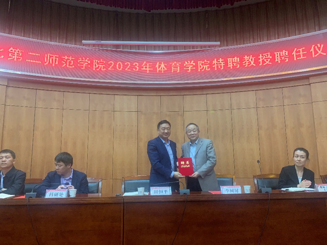 田恒平为李树屏教授颁发聘书,对李教授的加入表示欢迎,相信李教授的加入将有力推动我校体育学科的蓬勃发展。他要求,体育学院教师要抓住机遇、主动学习、虚心请教、积极配合。