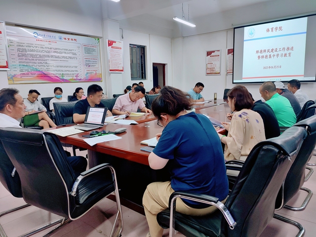 本网讯(通讯员 向琴英) 6月25日下午,体育学院在会议室召开全体教职工大会,启动师德师风建设工作推进暨师德集中学习教育。总支书记张绍明主持会议。