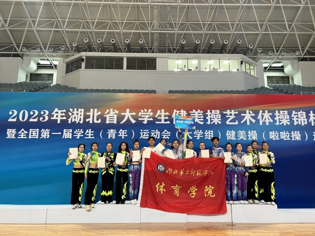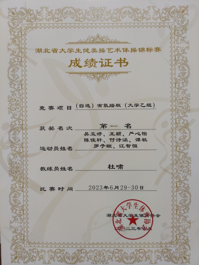 本网讯(通讯员 向琴英)2023年湖北省大学生健美操艺术体操锦标赛暨第一届全国学生运动会健美操(啦啦操)选拨赛于2023年6月30日落下帷幕,我校健美操队在指导老师杜啸的带领下获得大学乙组自选有氧踏板第一名、自选轻器械第二名、2017版规定踏板三等奖的好成绩。