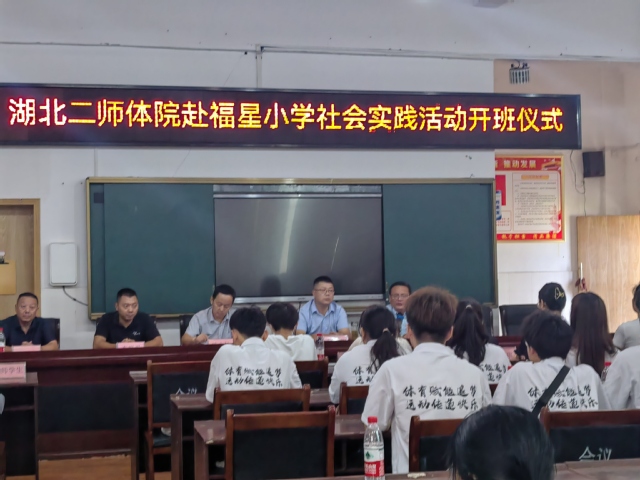 沉湖镇初中尹干事,福星小学全体校领导、优秀骨干教师,体育学院学工班主任辛雯、教学办主任胡颖、分团委负责人李祖平、辅导员何思琪、实践队全体成员参加开班仪式。