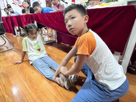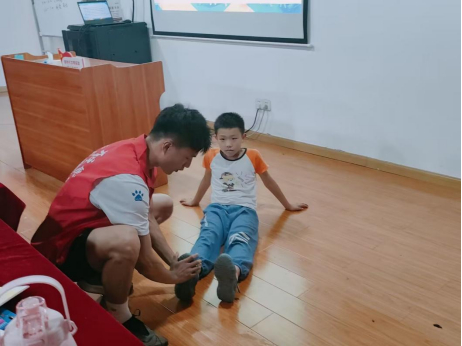 除此之外,杨帅同学还给小朋友们介绍了中暑,肌肉痉挛、岔气、晕厥、骨折等常见运动伤病的的治理方法,并邀请小朋友们参与了实操演练。