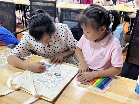 为了让防溺水意识入脑入心入眼,社区还特地准备了防溺水帆布包涂鸦环节。每组家庭发放一个印有防溺水图案的布包,让加战光和孩子共同通过调色、涂鸦、绘画、填充...等一系列步骤感受着溺水事件的情形,让家庭“沉浸式”体验,感受防溺水安全知识的重要性。