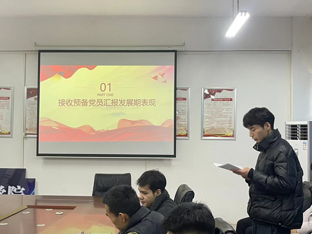 会议第一项,拟接收预备党员彭博等15名同志逐一就对党的认识、入党动机、培养考察期自身在学习、工作中的日常表现向支部大会做汇报。