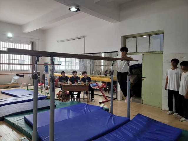 此次体操期末技术考试共分为四个部分,分别是单杠、双杠、跳马技术和自由操自编自成套动作。