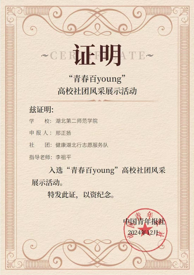 据悉,湖北第二师范学院健康湖北行志愿服务队成功入选“青春百young”高校社团风采展示活动,这是目前国内极具影响力与关注度的高校社团展示平台,旨在展现新时代高校社团的青春活力与社会责任感。此次入选不仅标志着健康湖北行志愿服务队在志愿服务与社会实践领域的卓越表现得到了广泛认可,也是该校社团活动质量与影响力不断提升的重要体现。本次选拔吸引了众多来自全国范围内的高校社团参与,而湖北第二师范学院健康湖北行志愿服务队凭借其出色的表现与积极的贡献,在近400个队伍中脱颖而出,成功入选,实现了该校在此类活动中的又一历史性突破。(审稿人:李祖平)
