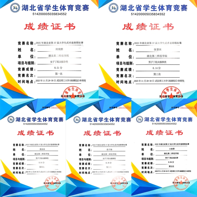 体育学院武术队学子奋勇拼搏,凭借扎实功底与精湛技艺,斩获多项佳绩。其中何琪雅获得女子太极拳类第一名,张慧欣获得男子太极拳类第三名,黄冰冰获得男子太极拳类第四名,王宿霏获得男子自选长拳第五名的优异成绩,展现了体育学子的昂扬风采。