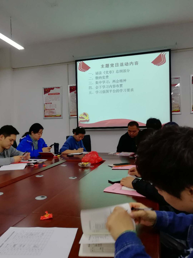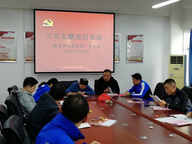 本网讯 (通讯员:谭清芳)体育学院教师第一党支部三月主题党日活动于2019年3月21日在体育学院会议室召开,由支部书记王丹主持,支部全体党员参加活动。本次主题党日活动内容一共5个:(1)诵读《中国共产党章程》总纲部分;(2)交纳党费;(3)集中学习与讨论:聚焦两会,领会两会精神;(4)布置分散学习内容;(5)明确提出学习强国平台的学习要求。