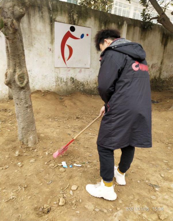 志愿者在校园勘察体育基础设施并进行义务卫生清洁