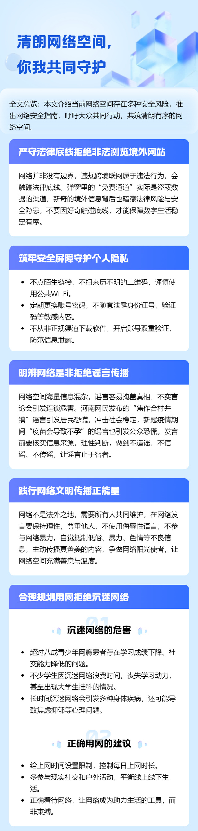 指尖触网,连接万千世界,也暗藏诸多风险。信息泄露、网络诈骗、非法浏览境外网站、谣言传播……这些隐患时刻威胁着我们的数字生活,守护网络安全,筑牢安全防线,是每个人的必修课。这份网络安全指南,邀你一起查收,共筑清朗网络空间! 一、严守法律底线,拒绝非法“浏览境外网站”严守法律底线,规范网络行为。网络疆界不可逾,违规跨境联网触刑律。弹窗里的“免费通道”,是盗取数据的暗哨;看似新奇的境外信息,背后藏着...